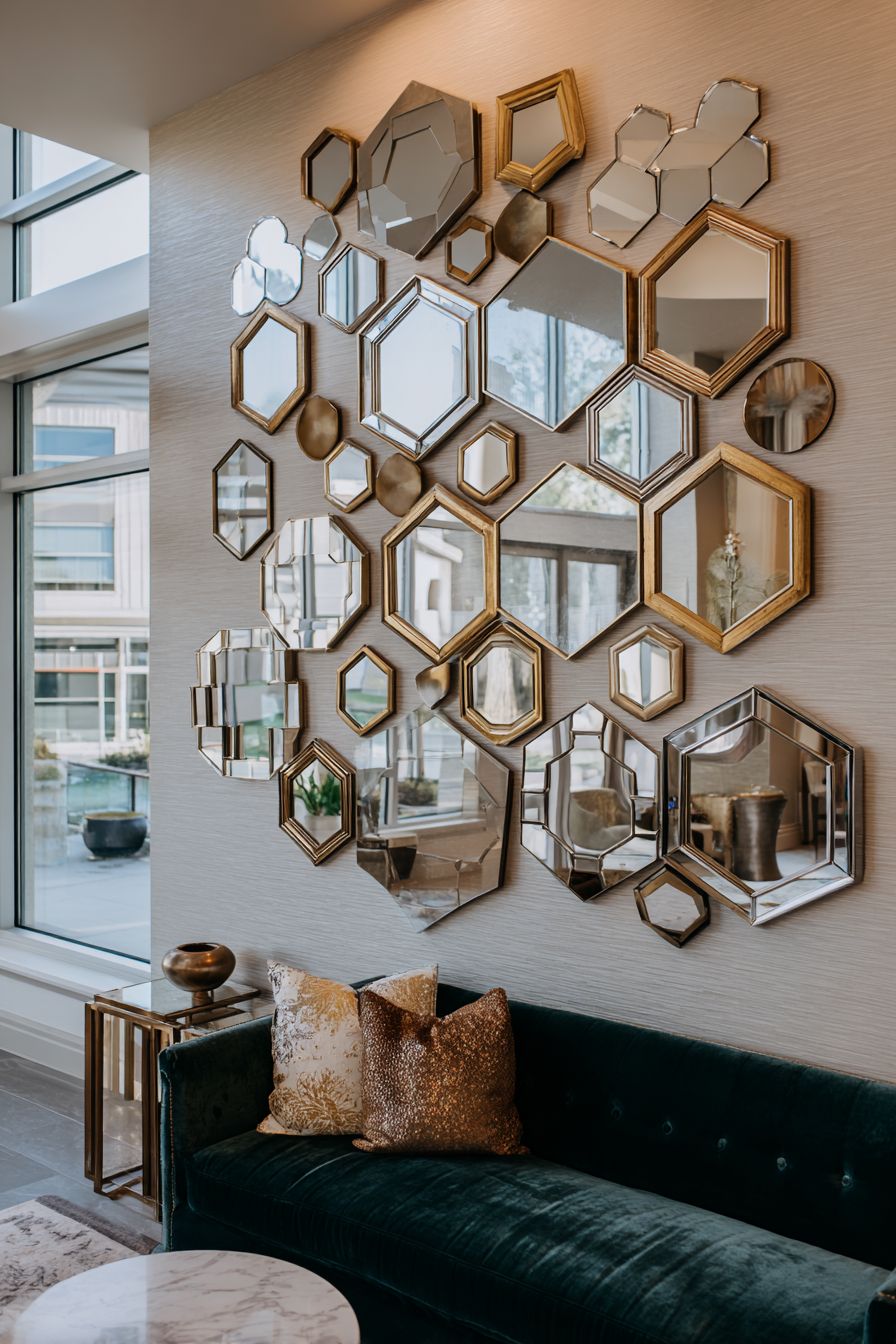 This mirror wall decoration idea works exceptionally well in living rooms where it can serve as the primary wall feature above substantial furniture pieces. A velvet sofa in deep emerald green positioned beneath the mirror display creates a luxurious color contrast, while decorative pillows and a marble side table complete the carefully curated vignette. The varying frame finishes catch light differently, adding dimension and preventing the metallic elements from feeling monotonous or cold. The asymmetrical arrangement feels organic and collected over time rather than overly staged.