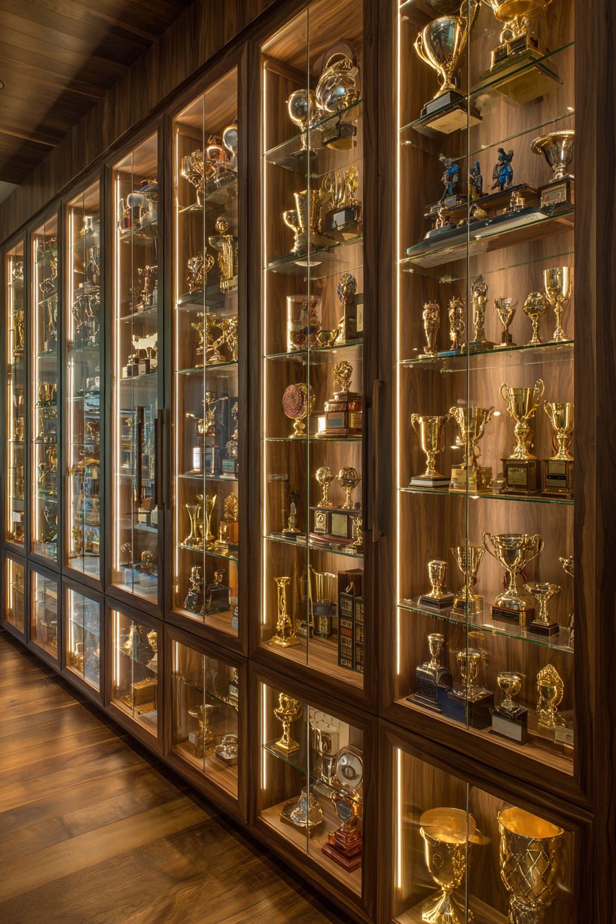 Trophies from various life achievements arrange thoughtfully alongside personal photographs creating narrative connections between the physical awards and the moments, people, and experiences they commemorate. The combination humanizes the display—trophies aren’t isolated objects but rather symbols connected to specific memories, relationships, and personal growth moments. Soft cove lighting hidden within the alcove’s architectural details creates warm ambiance without harsh spotlighting, the diffused quality suggesting quiet pride rather than boastful display.