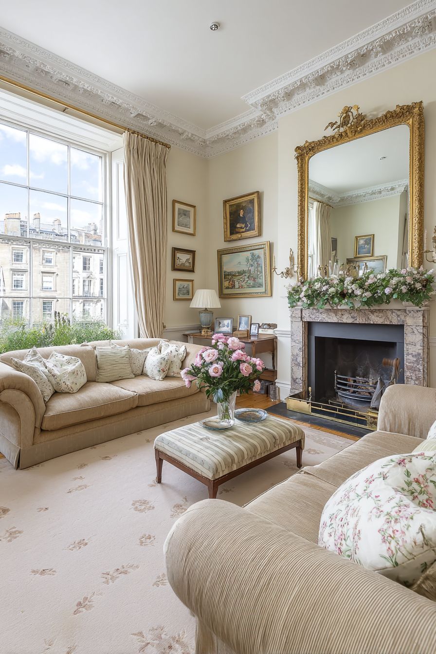 20. French Country Living Room with Large Antiqued Mirror